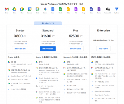 Starterで1アカウントだけなら月800円からです。無料Gmailは15GBですがStarterは30GB。