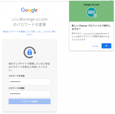ブラウザがChromeの場合は「新しいプロファイルで続行しますか?」と尋ねられます。「OK」をクリックすると「新しいプロファイル」が作られてアカウントを切り替える毎にブラウザの色を変えるなどすることができます。