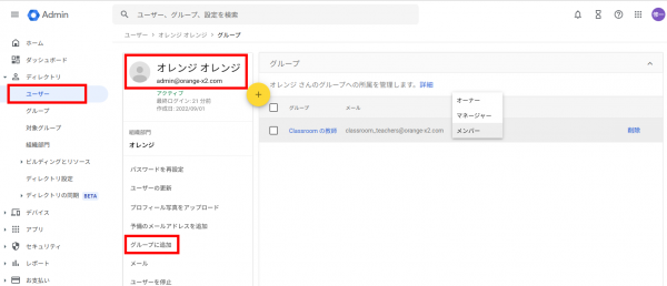 ディレクトリ>ユーザー で対象ユーザを選んで グループに追加 でClassroomの教師 を追加。