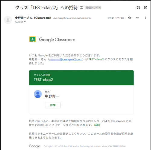 あらためて招待します。このような招待メールが届きます。「参加」をクリック。