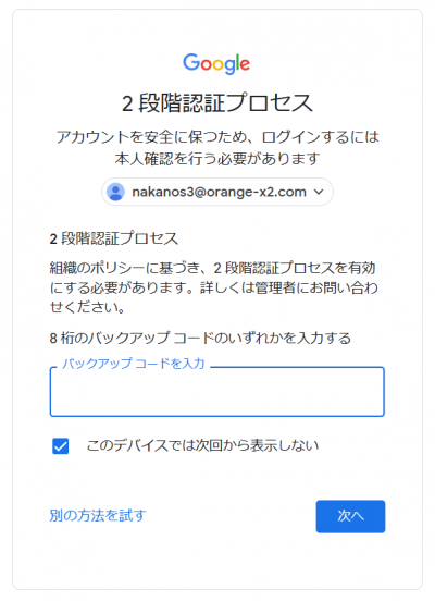 前回しましたが、 組織全体は「ユーザーが 2 段階認証プロセスを有効にできるようにする」は有効。[適用]の項目を「強制しない」にしてあると思います。