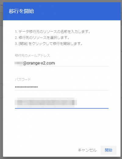 @アカウント>データの移行 で次の3つを入力します。この時移行元のユーザでIMAPを許可しておく必要があります。