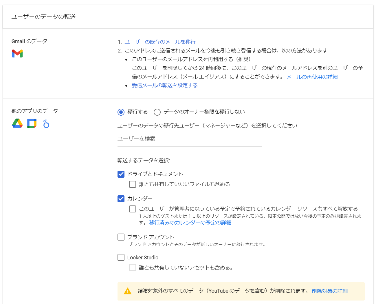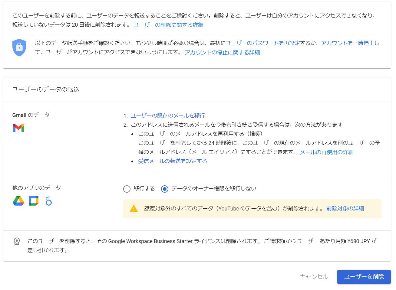 残さないときは、「データのオーナ権限を移行しない」を選択し、「ユーザーを削除」をクリックします。